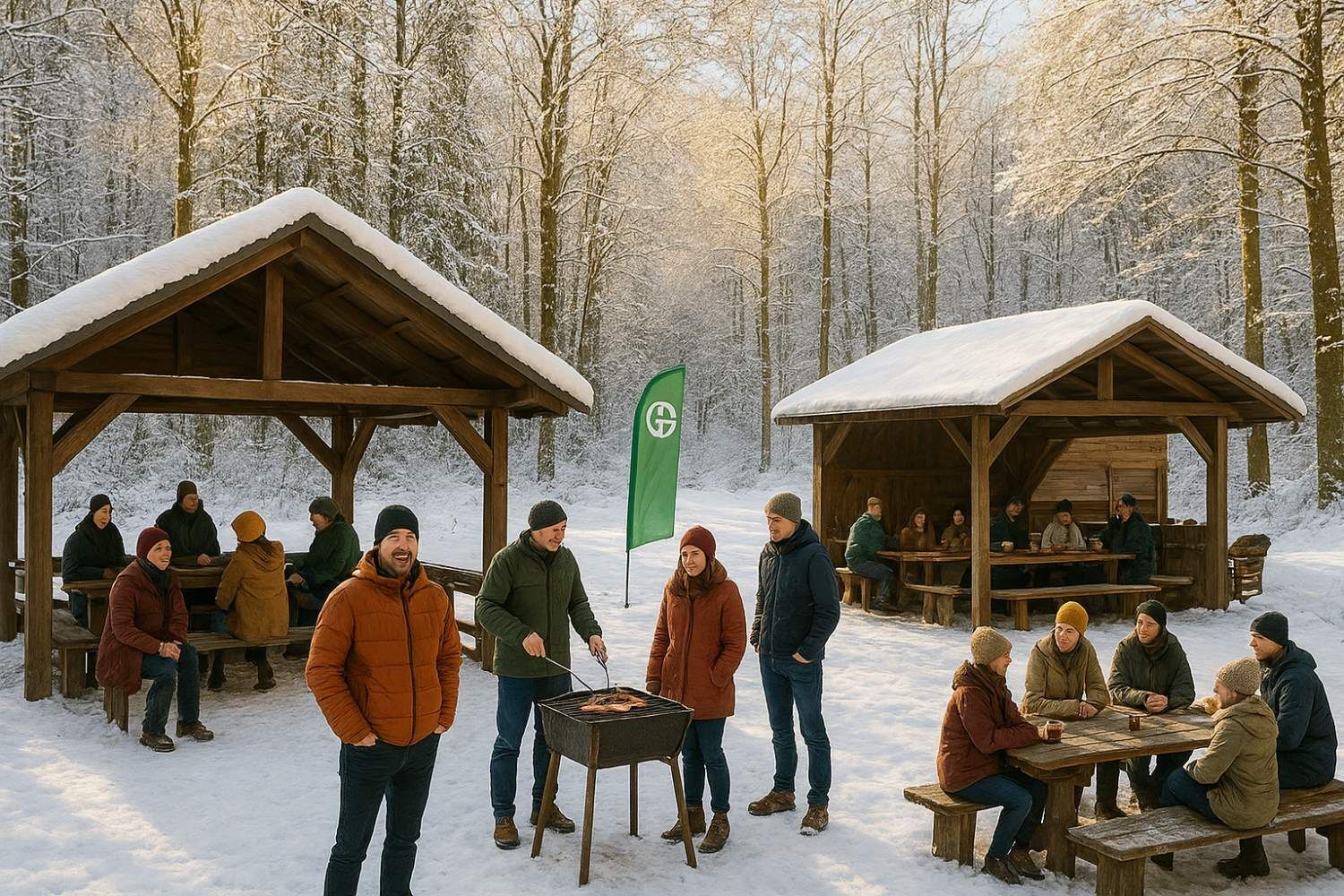 - Eine überdachte Grillhütte und eine weitere große Hütte mit vielen Sitzgelegenheiten innen und außen