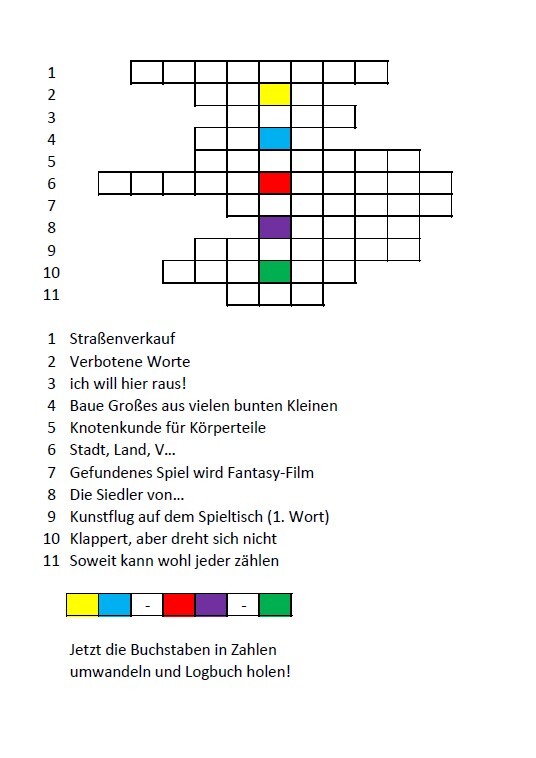Bringt bitte möglichst ein Namensschild mit eurem Geocacher-Team-Name und natürlich ein Ausweisdokument oder etwas ähnliches mit, da wir für die Spieleausleihe ein Pfandleihsystem haben.